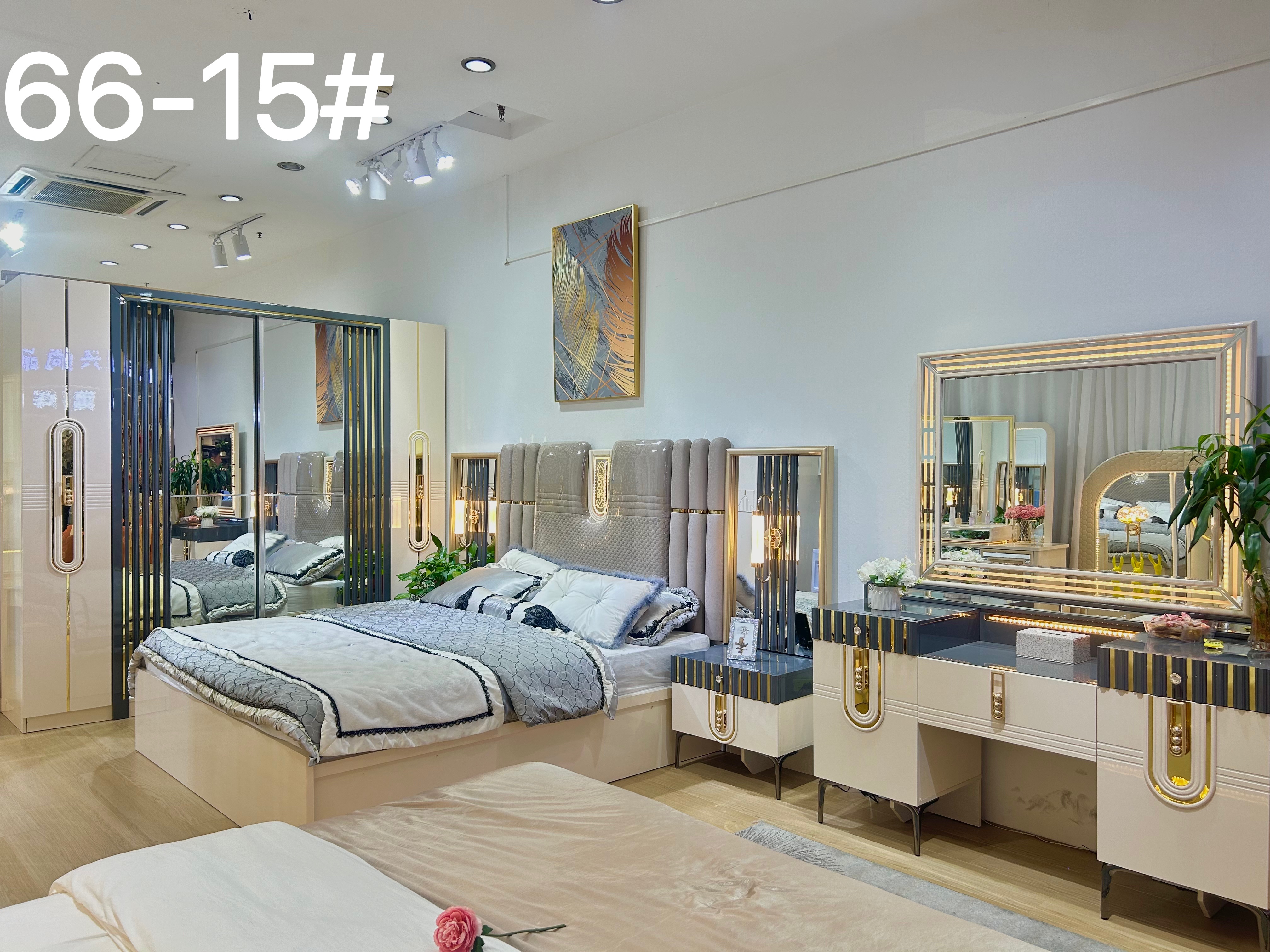 Bed room set Set of 7 pieces: Bed 1, bedside table 2, wardrobe 1, dressing table 1, mattress 1 and bench 1 Seti ya chumbani, pisi saba pamoja na godoro la kisasa na benchi